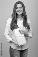 Young woman with long brown hair in casual clothes holding laundry detergent. Isolated portrait on gray.