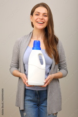 Woman in casual clothes blue shirt and jeans holding laundry detergent in white big bottle.