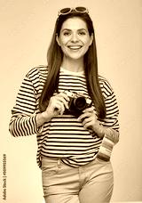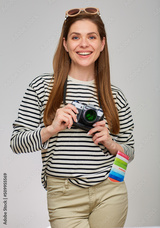 Woman in striped shirt holding photo camera. Girl portrait on isolated gray background. Pssport in pants pocket.