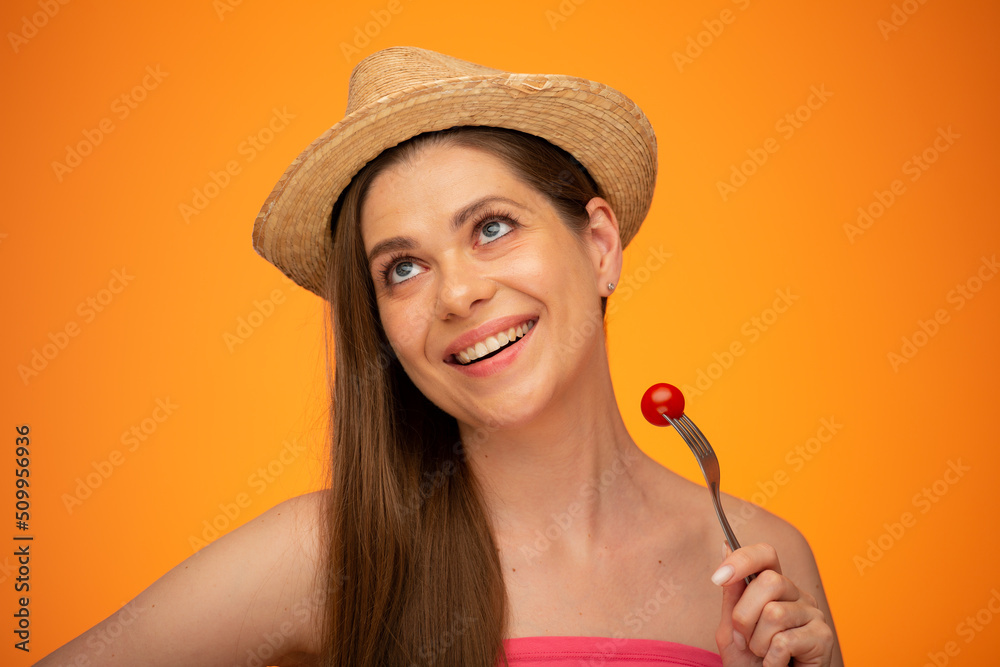 Smiling woman with bare shoulders and Mexican hat looking up and eating tomato, isolated portrait in beauty style, girl face portrait with natural no retouching skin.