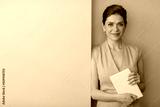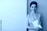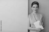 Teacher woman standing near wall with copy space. Girl student holding book.