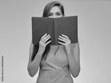 Woman teacher or business woman, student covered her face with open book isolated portrait.