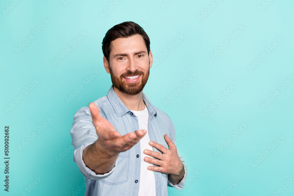 Photo of affectionate guy invite his girlfriend wife dance ceremony disco isolated on cyan color background