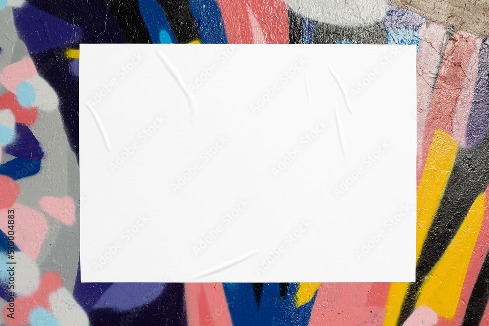 Closeup of colorful black yellow pink painted urban wall texture with wrinkled glued poster template. Modern mockup for design presentation. Creative urban city background.