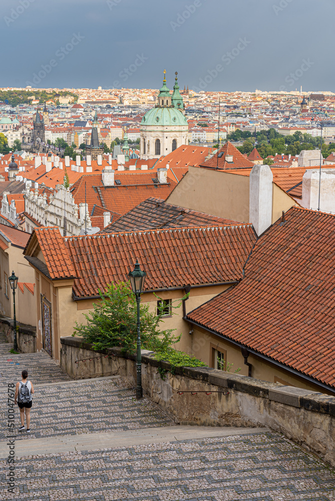 High angle view of Prague skyline, Czech Republic. Red roofs of old town with dark sky before storm