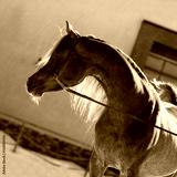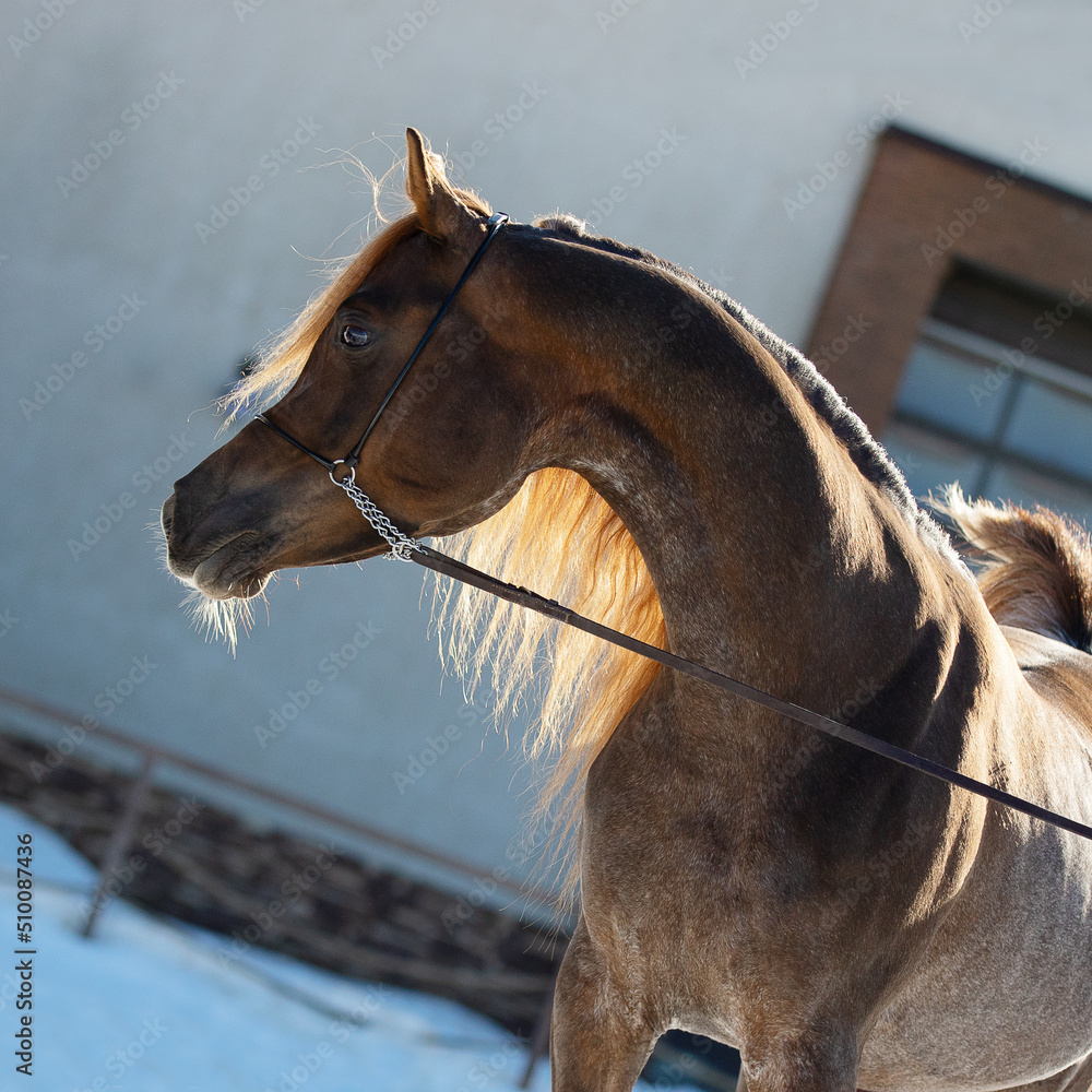 Head of a beautiful chestnut arabian horse with long mane, portrait closeup.