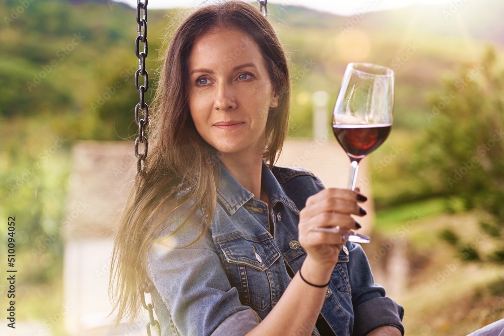 Woman relaxing drinking tasting red wine outdoor in garden. Authentic and atmospheric moment.