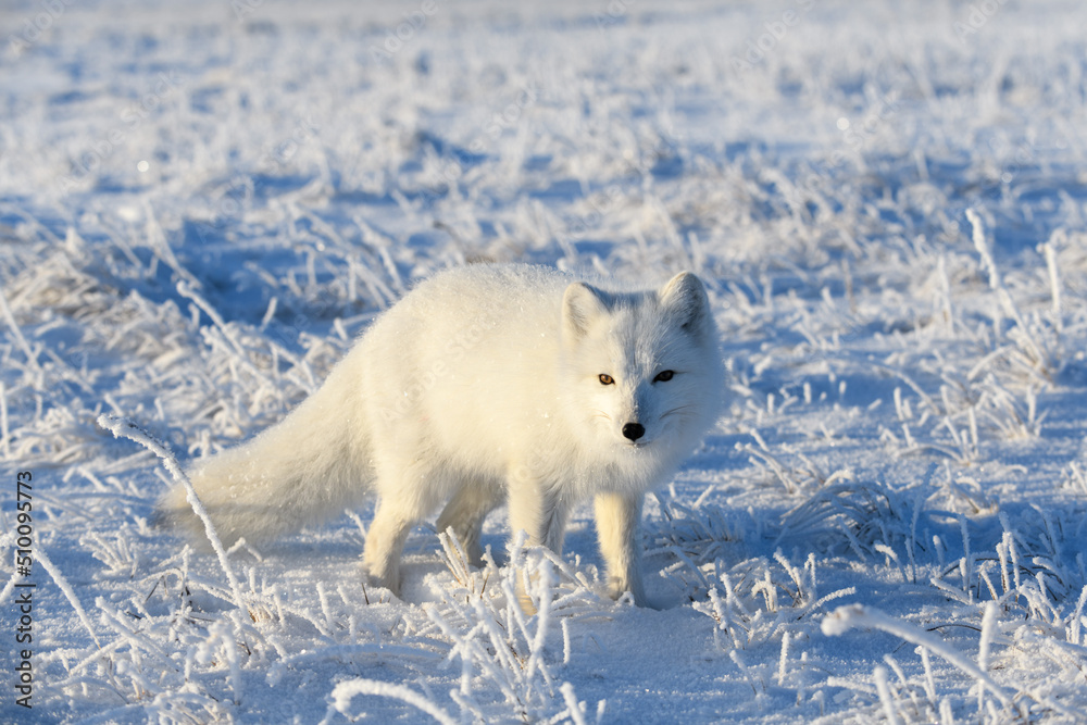 Wild arctic fox (Vulpes Lagopus) in tundra in winter time. White arctic fox.