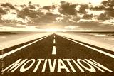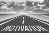 Motivation text on a highway at the beach leading to a beautiful sunset.