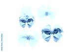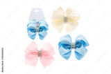 Kit, set of colorful of satin bow hair for girl, woman isolated on white background. Scrunchie hair clip accessory for girls and women. Pastel pink, blue, cream colors. Close up.