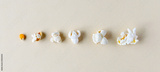 Stages of preparation of popcorn. Grain of corn and popcorn on a pastel background. Banner.