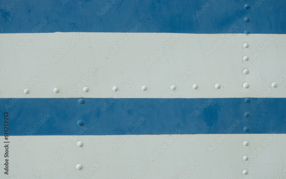 Vintage metal covering. White and blue paint skin with rivet. copy space. Soft focus.