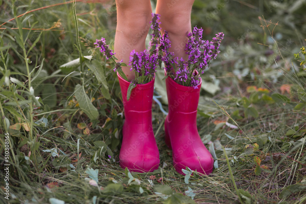 Red rubber boots on the feet of a girl with a bouquet of wild flowers. Flowers in a boot, summer time. Summer, freedom, nature, countryside, green grass in the field