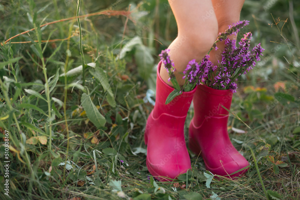 Red rubber boots on the feet of a girl with a bouquet of wild flowers. Flowers in a boot, summer time. Summer, freedom, nature, countryside, green grass in the field