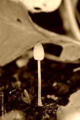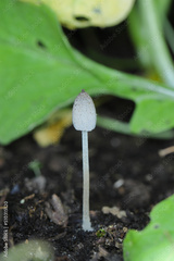 A tiny mushroom of the genus Coprinus grew in a bed where vegetables are grown.