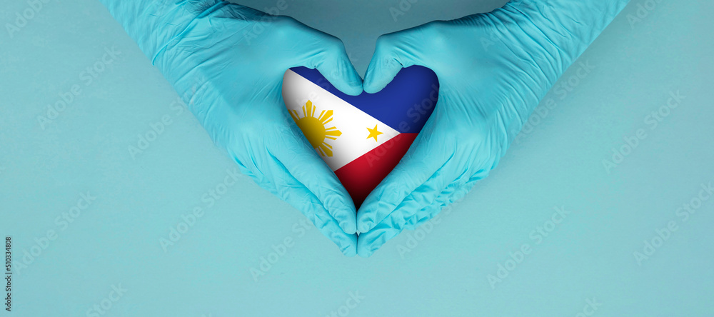 Doctors hands wearing blue surgical gloves making hear shape symbol with philippines flag