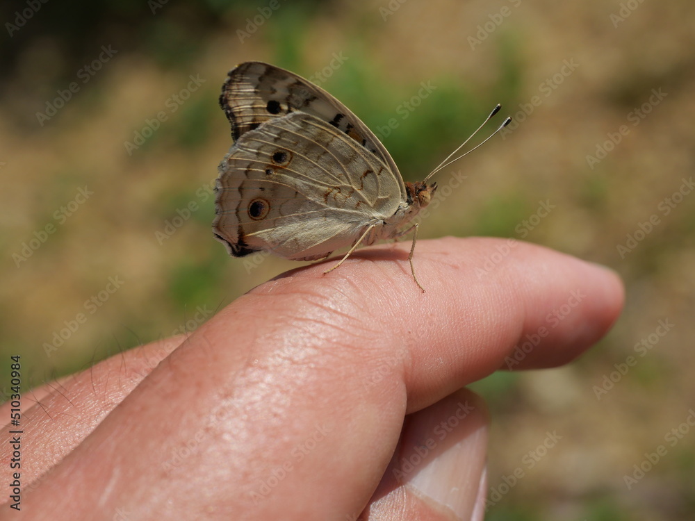 Blue Pansy Butterfly on human finger and hand with natural brown background