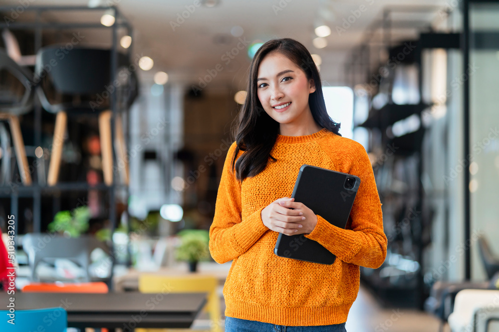 asian female smart entrepreneur walk working use tablet device stock manage and checking product inventory in furniture showroom,asian woman smiling cheerful business owner work in furniture store