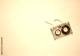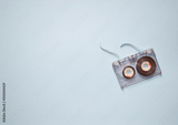 Audio cassette with torn tape on a blue background, top view, place for text.