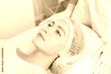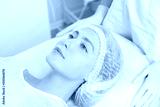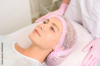 Image of a young beautiful woman dressed as a patient, lying on a couch in a cosmetology clinic.