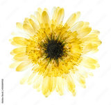 Pressed and dried delicate yellow flower on white background