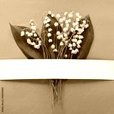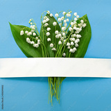 greeting card with lily of the valley flowers on a blue background, flat lay for design, top view, place for text, floral spring background