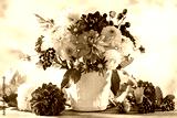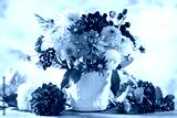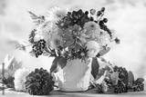 Autumn still life with garden flowers. Beautiful autumnal bouquet in vase on wooden table. Colorful dahlia, chrysanthemum and berries.