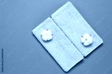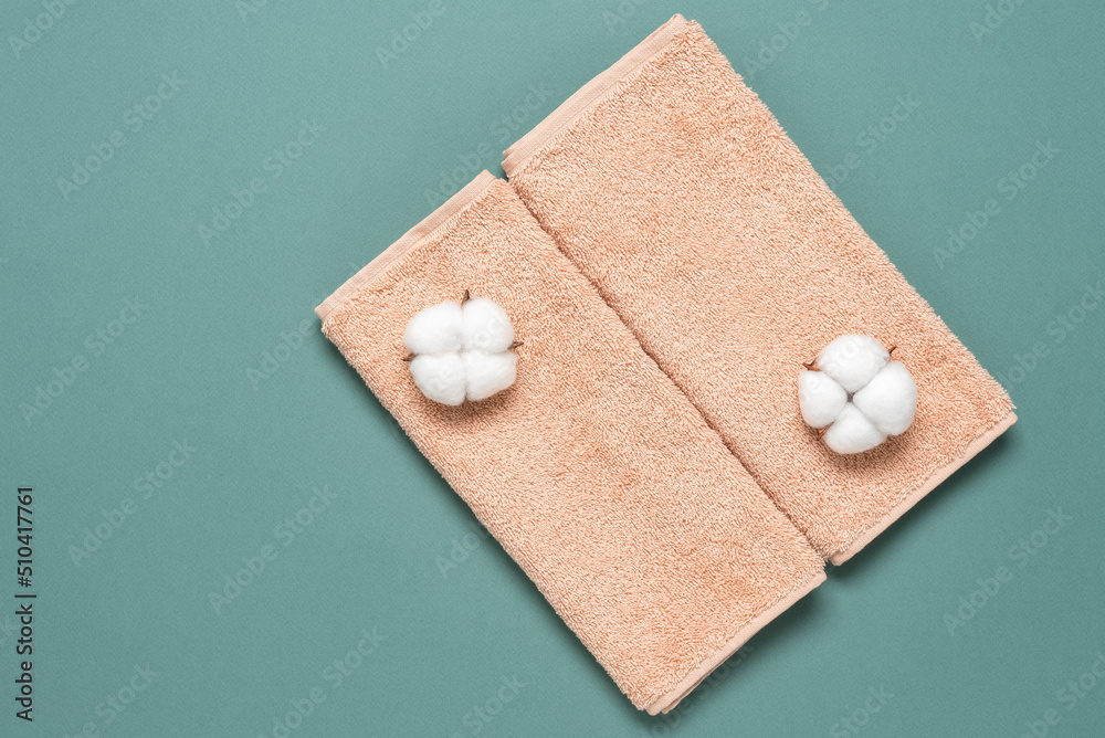 Beige terry towels and cotton flowers on a turquoise pastel background. Top view, flat lay.