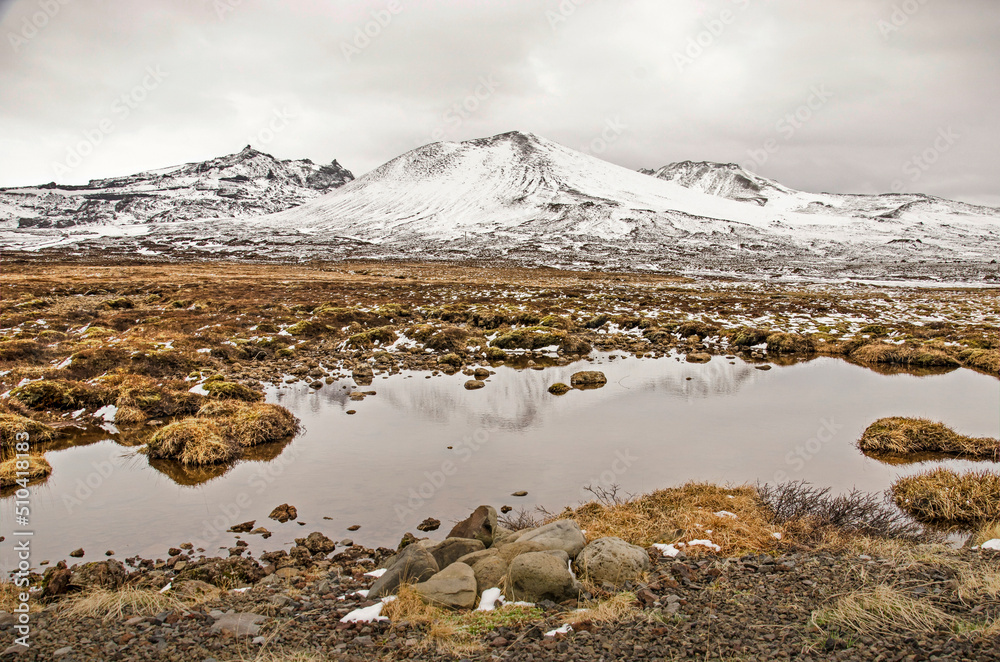 shallow pond in a field with moss, grass and rocks, with snow-covered mountains in the background, at Snaefellsness peninsula in Iceland