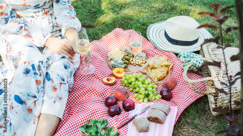 Cropped picture of a girl sitting on a grass on nature. Concept of having picnic in city park during summer weekends.
