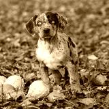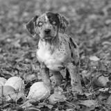 Louisiana Catahoula puppy with pumpkins in Autumn