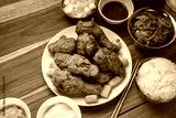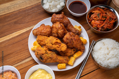 Delicious Korean fried chicken with cheese dipping sauce traditional Korean food, Fried chicken and korean rice cake with cheese dipping on wooden table.