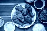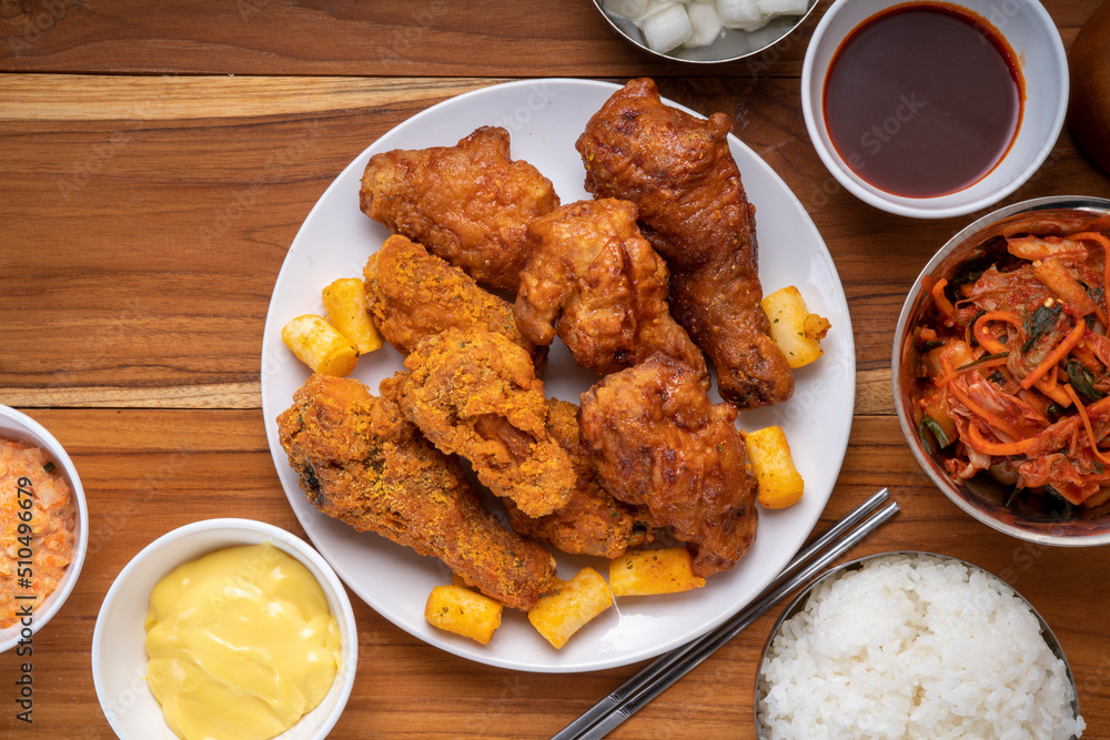 Delicious Korean fried chicken with cheese dipping sauce traditional Korean food, Fried chicken and korean rice cake with cheese dipping on wooden table.