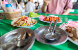 Spicy green papaya salad or Som Tum with Thai rice noodles. Street food with hot and spicy dish in Thailand. The famous local Thai street food. Thai Esarn cuisine. Papaya salad with grilled chicken.