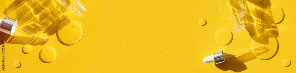 pipette drop of whey test on yellow sun glare background banner with place for advertising text
