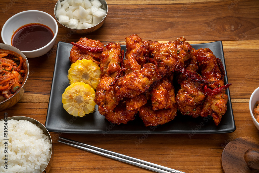 Korean fried chicken with spicy sauce traditional Korean food, Fried chicken with sweetcorn and Kimchi pickle on wooden table.