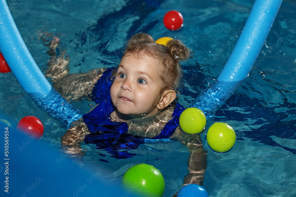 Little curly toddler girl learns to swim in swimming pool using foam stick.
