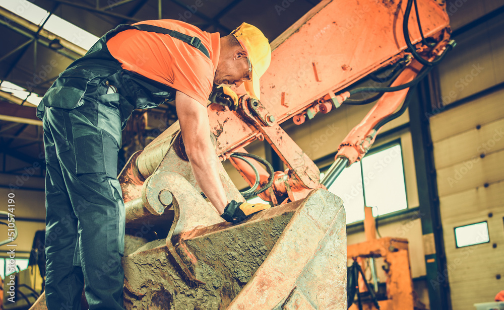 Excavator Mechanic Taking Closer Look Into the Crawler Bucket