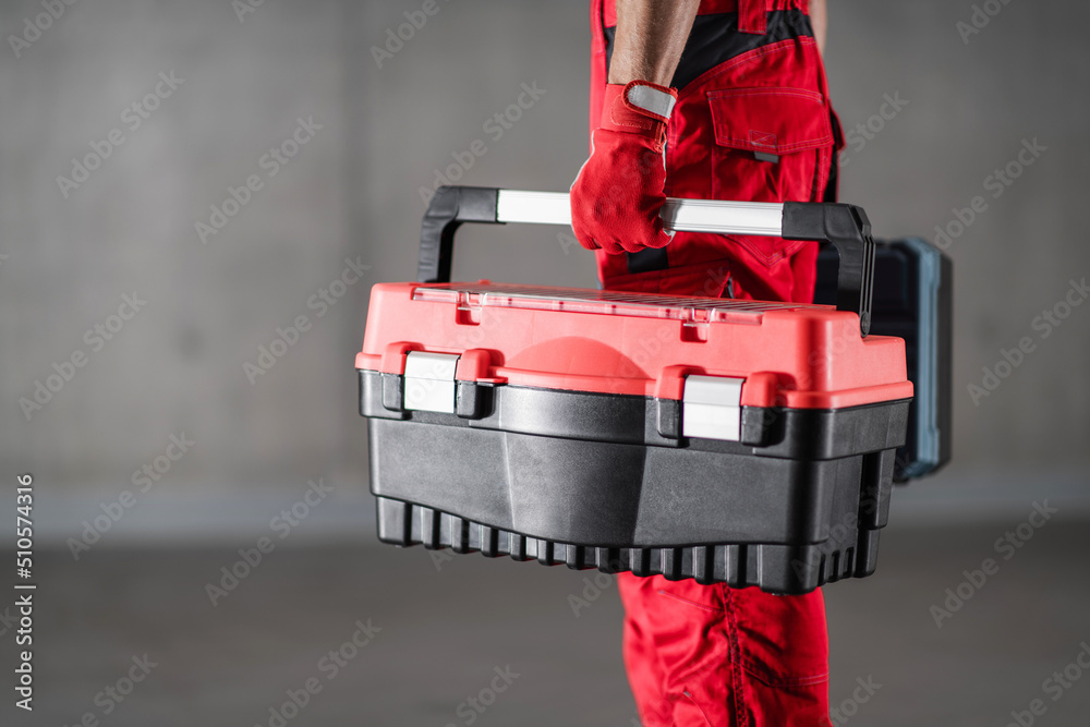 Repairman Home Call Concept with Handyman Holding His Toolbox.