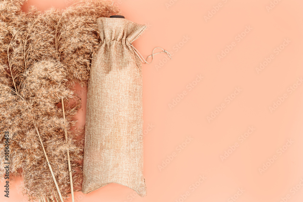 Fall mockup with wine bottle bag blank and dry reeds, copyspace, top view. Boho wine bag mock up grass for decoration design. Autumn sale flatlay mock up. Ecology concept.