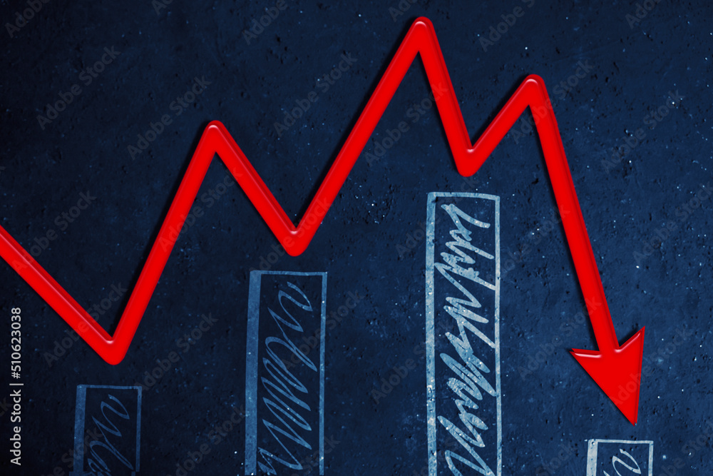 Declining red arrow and graph on blackboard