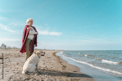 Woman and her pet contemplating waves on the water surface