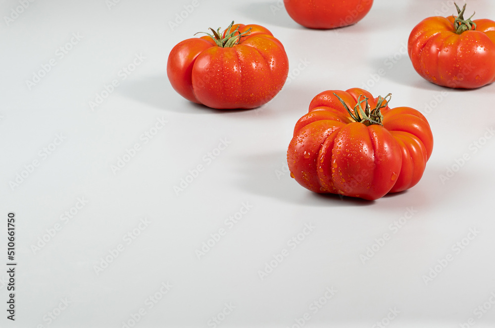 A group of Costoluto big tomatoes on a grey background, space for text.