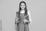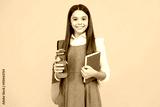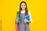 Teenager school girl with backpack holding water bottle isolated on yellow background.