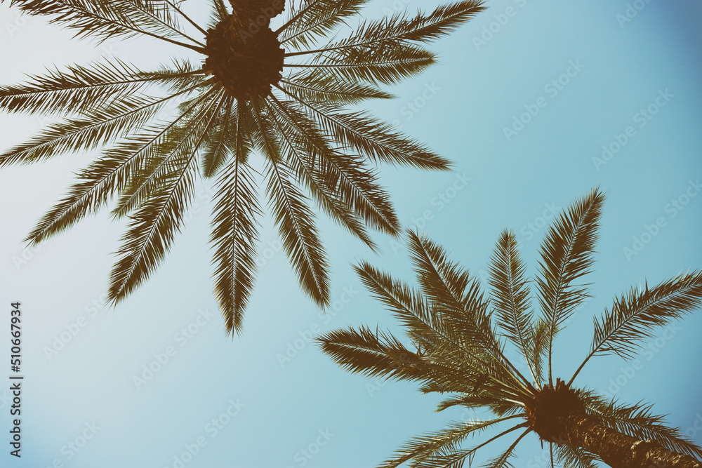 Palm trees against sky. retro style image. travel, summer, vacation and tropical beach concept.