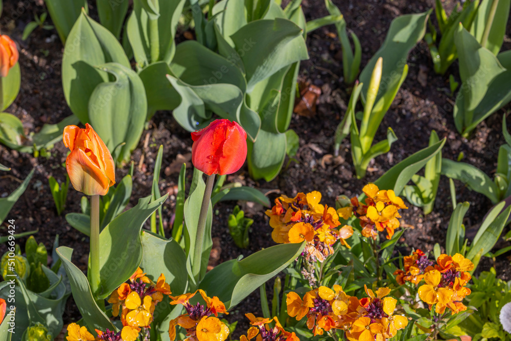 Beautiful view of yellow red tulips and orange petunia flowers with water drops after rain. Sweden.