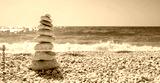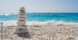 Stacked stones on a beautiful white pebble beach in the Mediterranean
