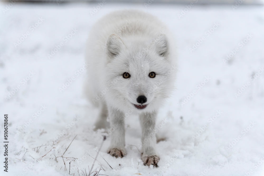 Wild arctic fox (Vulpes Lagopus) in tundra in winter time. White arctic fox.