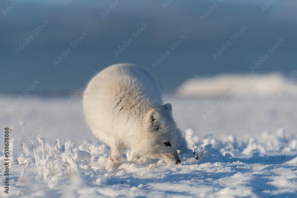 Wild arctic fox (Vulpes Lagopus) in tundra in winter time. White arctic fox.