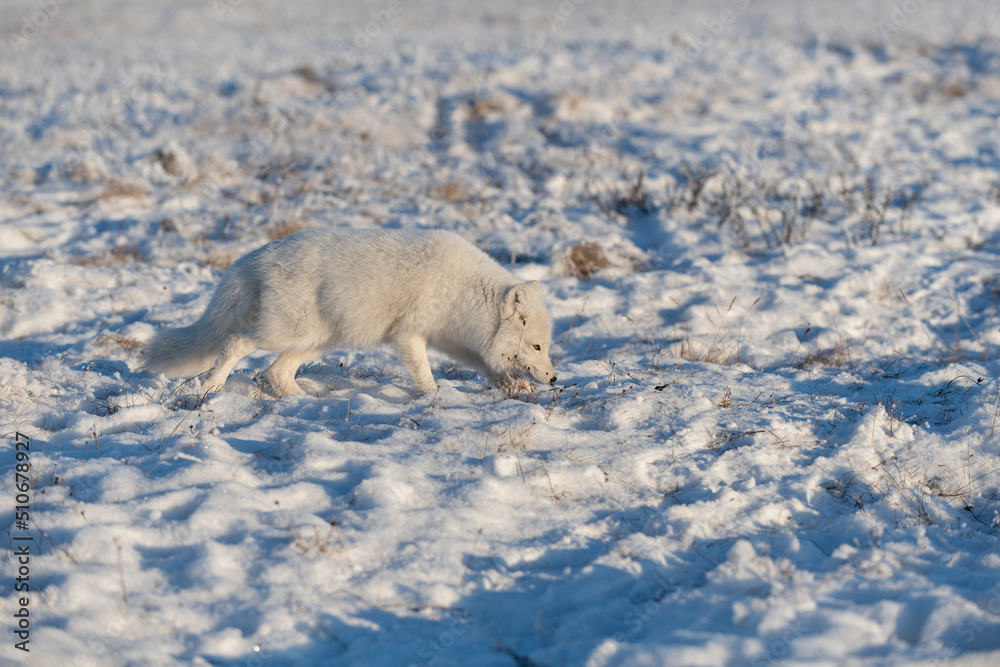 Wild arctic fox (Vulpes Lagopus) in tundra in winter time. White arctic fox.